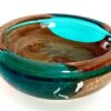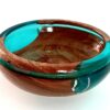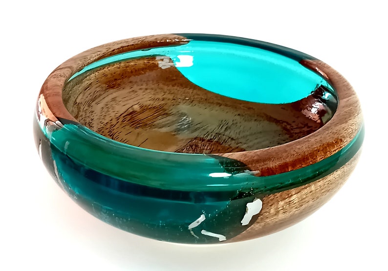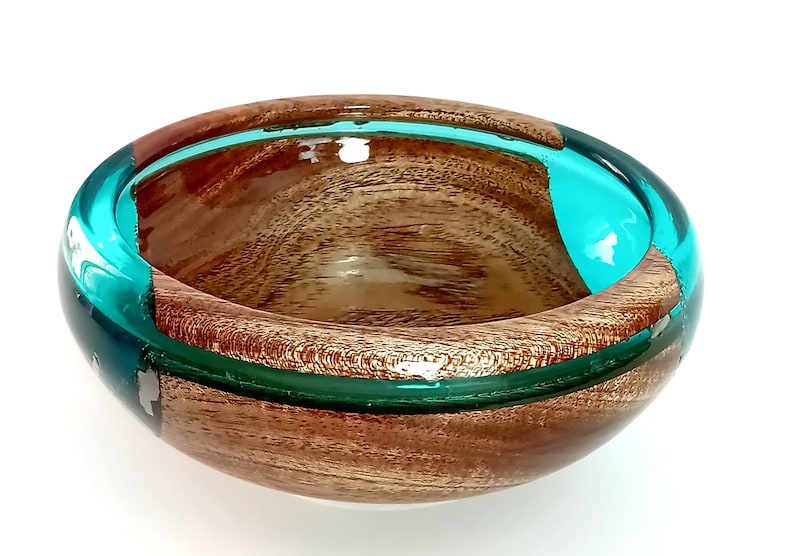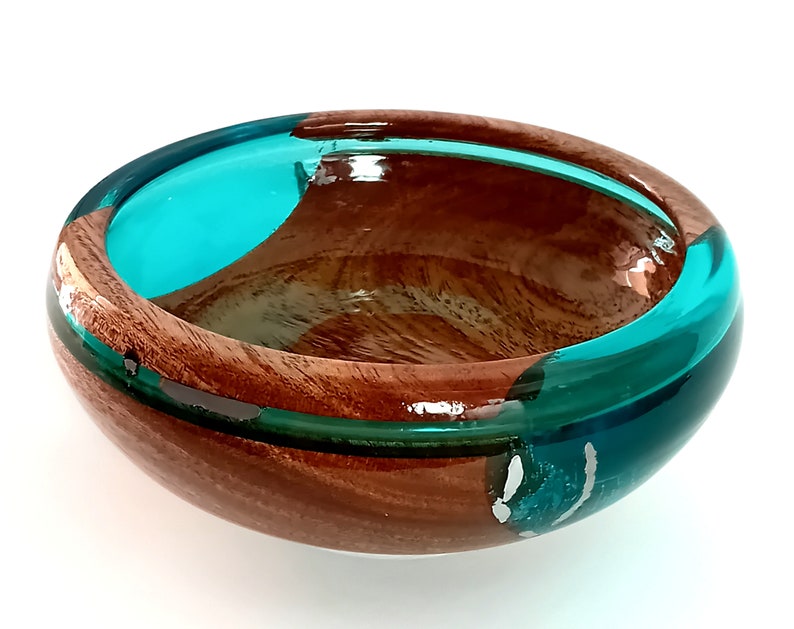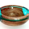 This exquisite bowl is a harmonious blend of organic and modern materials. It features a smooth, niangon wood base that seamlessly transitions into stunning blue epoxy glass, accented with elegant spots of shimmering silver.