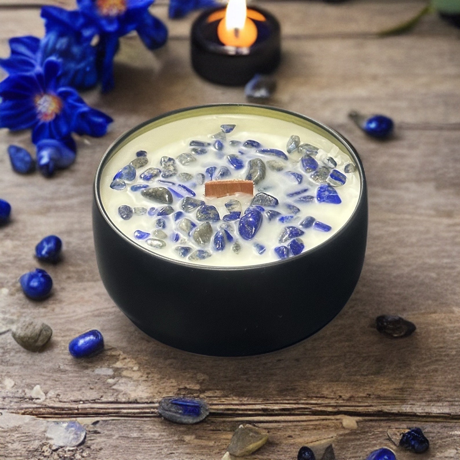 The candles are made with Coco Soy wax, high quality phthalate free fragrance oils and have a crackling wooden wick. Each candle will contain one Lapis Lazuli charged stone and several stone chips.