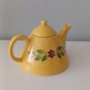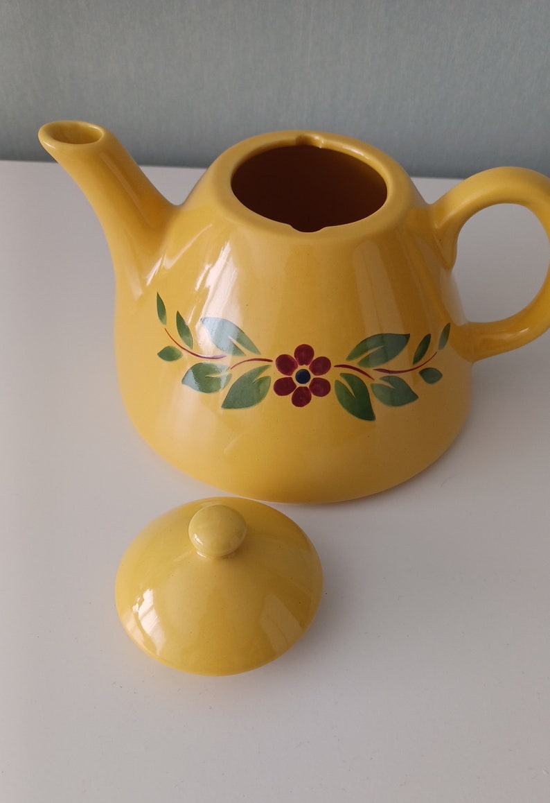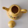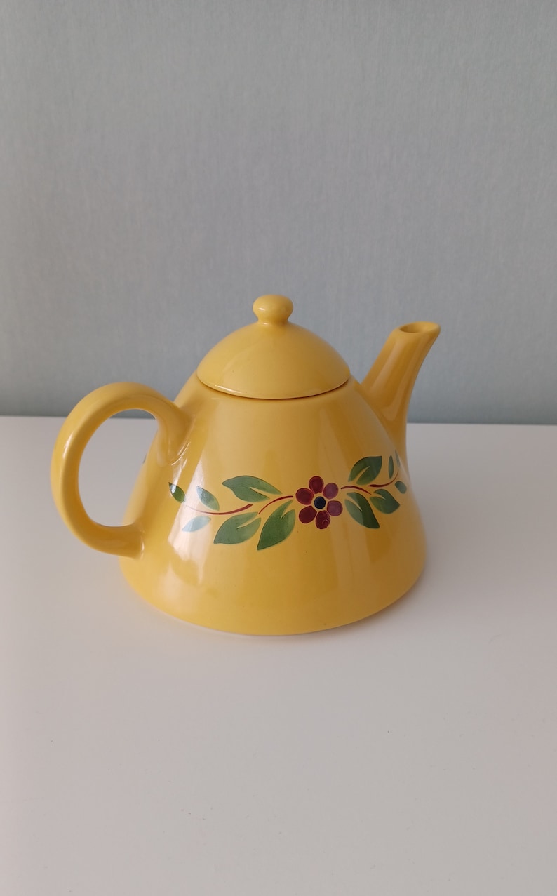 The pot is hand-painted with a beautiful floral pattern and has vibrant colorus—a sunny yellow base with green, blue, and burgundy floral patterns.